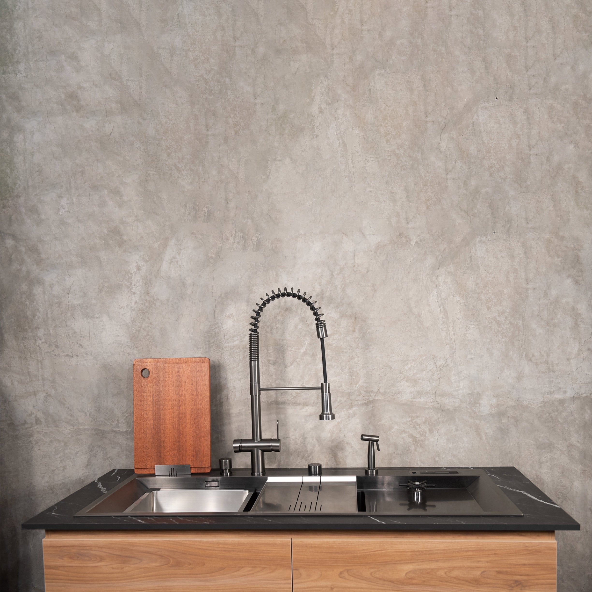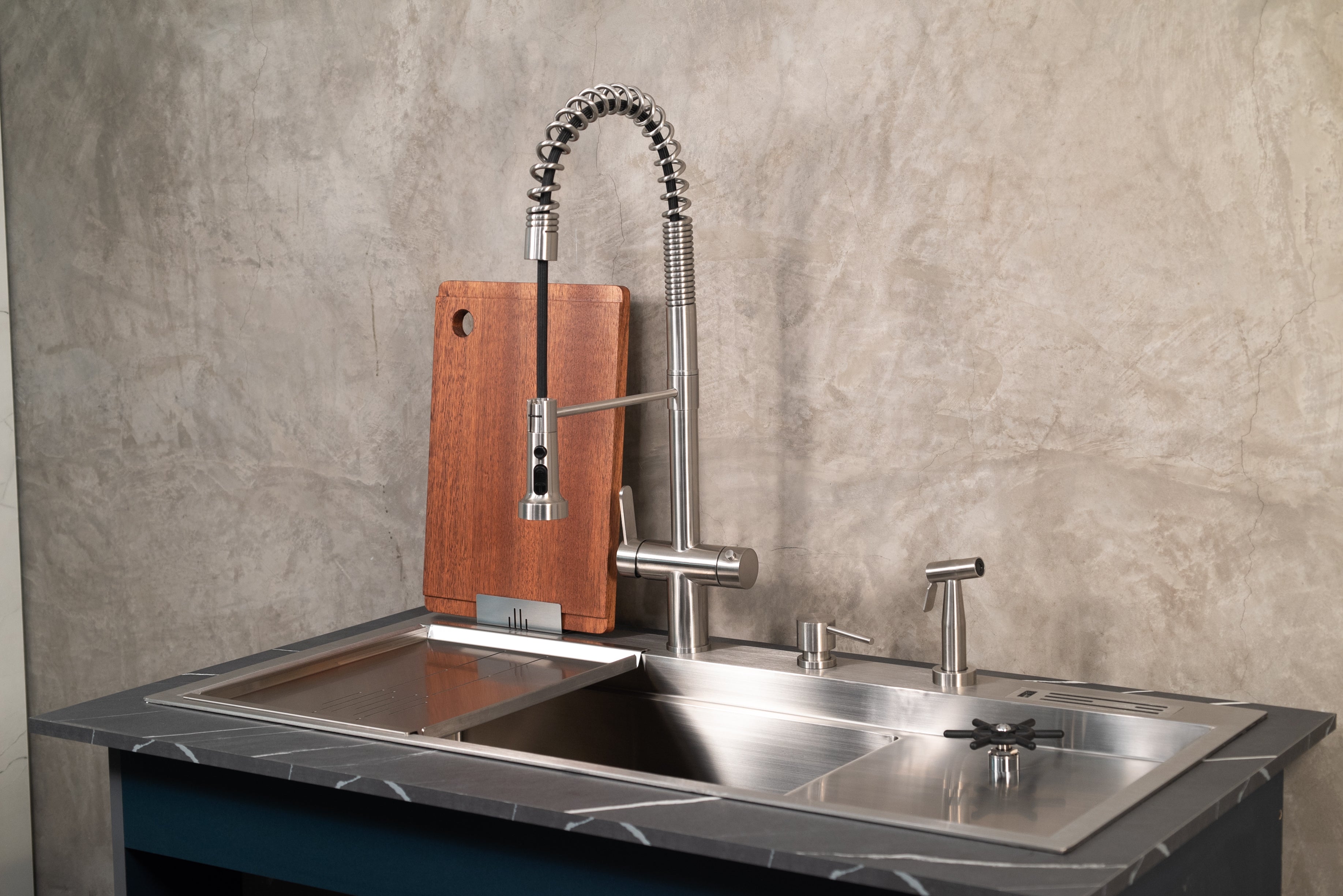 Parrilla para escurrir, tabla para picar, roll mat, dispensador de jabón, control de desagüe inteligente y más.