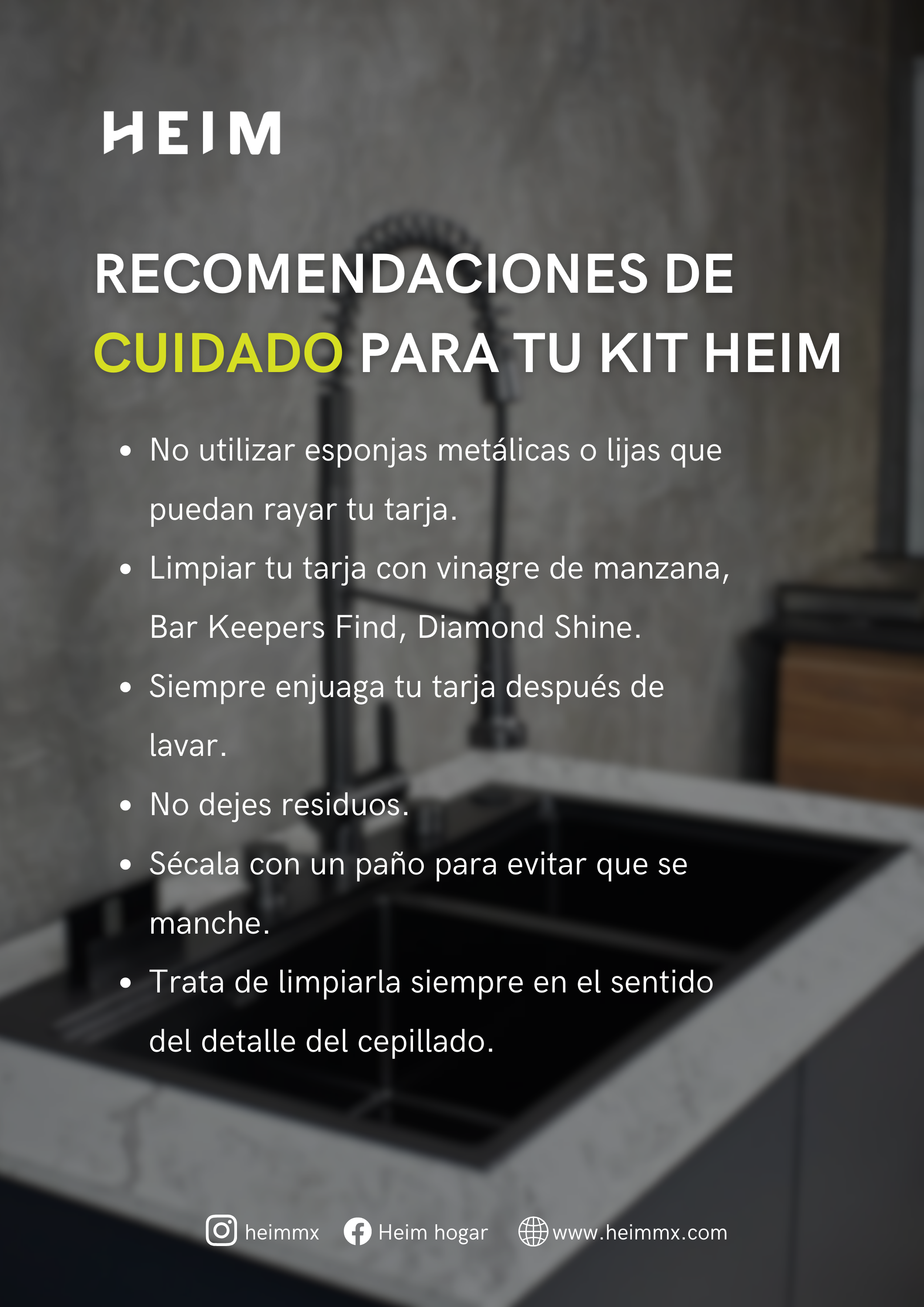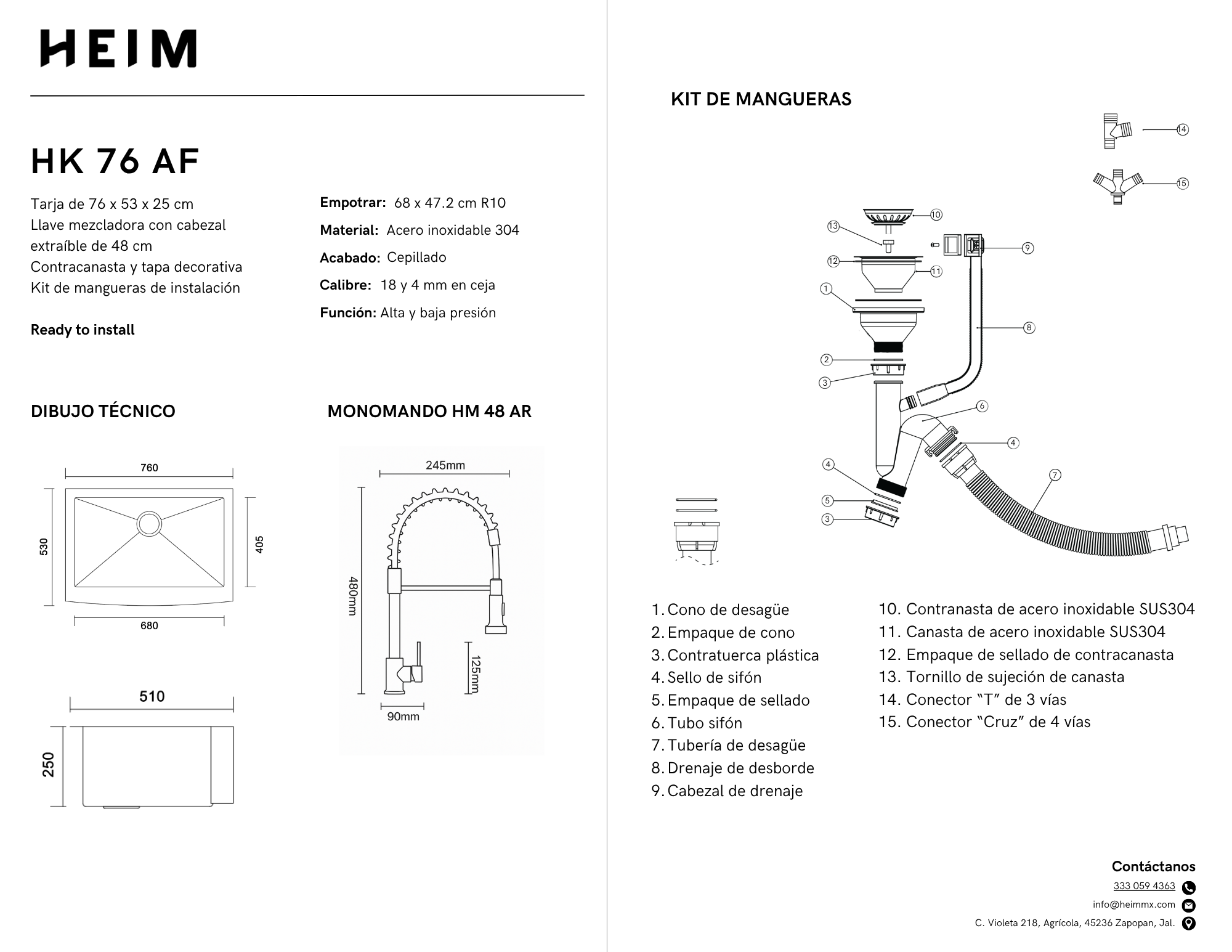 Nuestro modelo HK 76 AF presenta un sofisticado diseño Farm Kitchen que equilibra elegancia y funcionalidad para usuarios exigentes. Con dimensiones de 76 x 53 x 22 cm, esta tarja de una tina en acero inoxidable 304 calibre 18 incluye mezcladora con cabezal extraíble, contracanasta, tapa decorativa y kit de instalación completo. Su acabado cepillado y borde de 4 mm complementan cualquier cocina contemporánea. Compatible con sistemas de alta y baja presión, incluye plantilla para submontar (68 x 47.2 cm R10). Respaldado por 5 años de garantía y envío gratuito, viene listo para instalar.